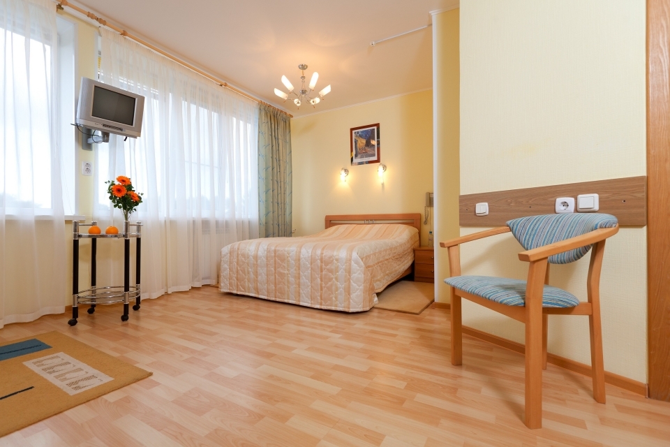 Описание: просторный однокомнатный номер для размещения одного человека или семьи. По комфортности это номер класса "Люкс", отличие состоит в том, что он не разделен на 2 помещения (гостиная и спальня). Места для сна, отдыха, чаепития выделены при помощи зонирования.